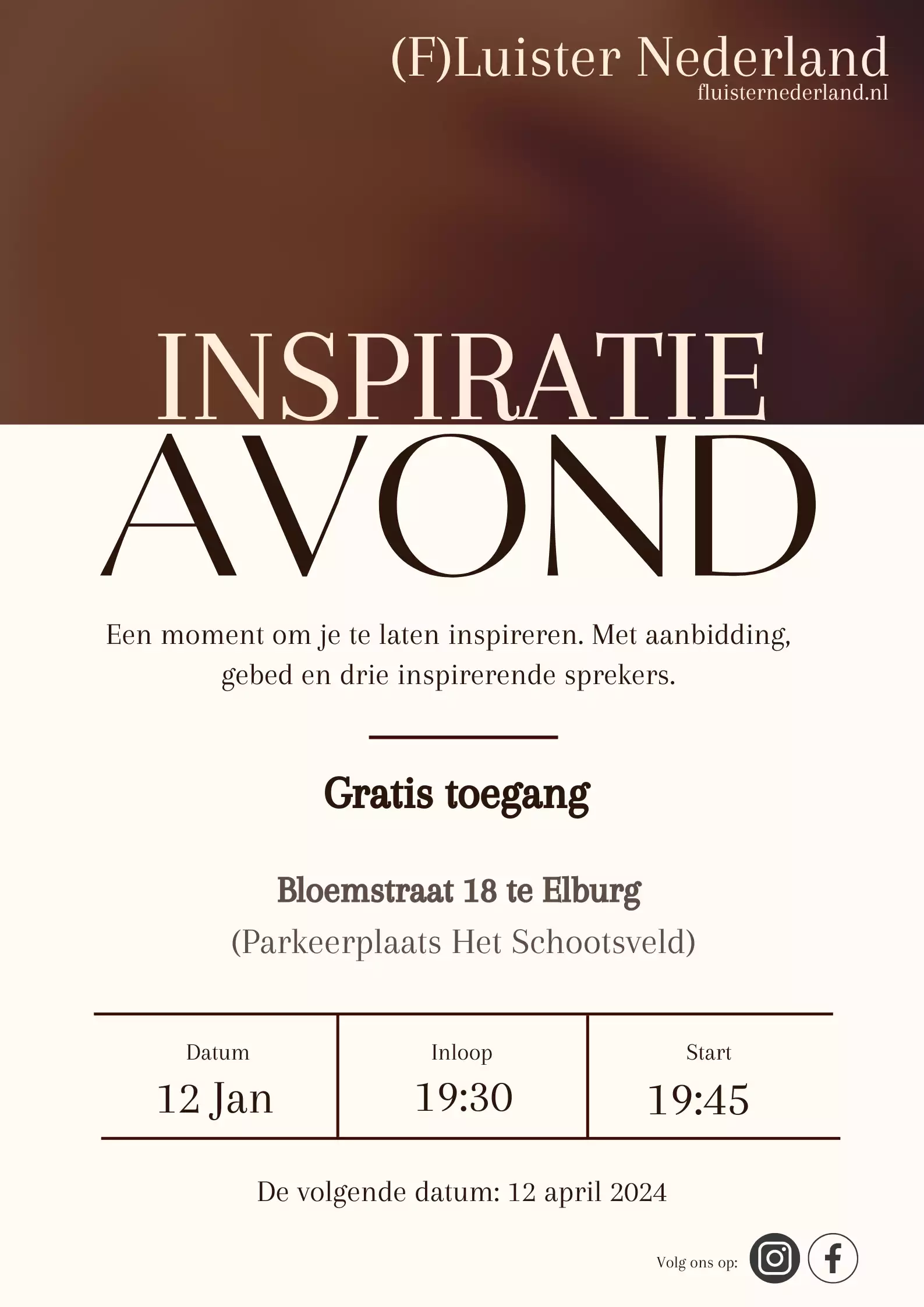 Wees dan welkom op onze eerste inspiratie-avond! Vanaf 19:30 staat er koffie en thee met wat lekkers voor je klaar. Om 19:45 starten we de avond met het zingen van aantal liederen, waarmee we God willen prijzen en aanbidden om Wie Hij is. Vervolgens zullen we luisteren naar drie sprekers uit ons team, die kort zullen delen wat zij in hun hart hebben ontvangen van God. We hopen dat dit je mag inspireren!